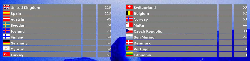 (An der Seite stehen die Länder welche die Punkte vergeben haben, oben und unten jene die die Punkte erhalten haben.)